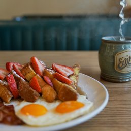Ernie's is an awesome place to have breakfast. The service was great, the food was clean and delicious, and has a menu with everything you can possibly think of for breakfast. We had the huevos rancheros and the green acres scram. The best thing was the green acres because it had tons of veggies which is what I was looking for. It was clean and not greasy at all. The huevos rancheros was great. Even better the next day as leftovers. Portions are on the bigger side so bring your appetite. I would highly recommend this place. Put yourself on the Yelp Waitlist to save time. Parking is a bit challenging in the front but there are spaces on the side and back of the restaurant.